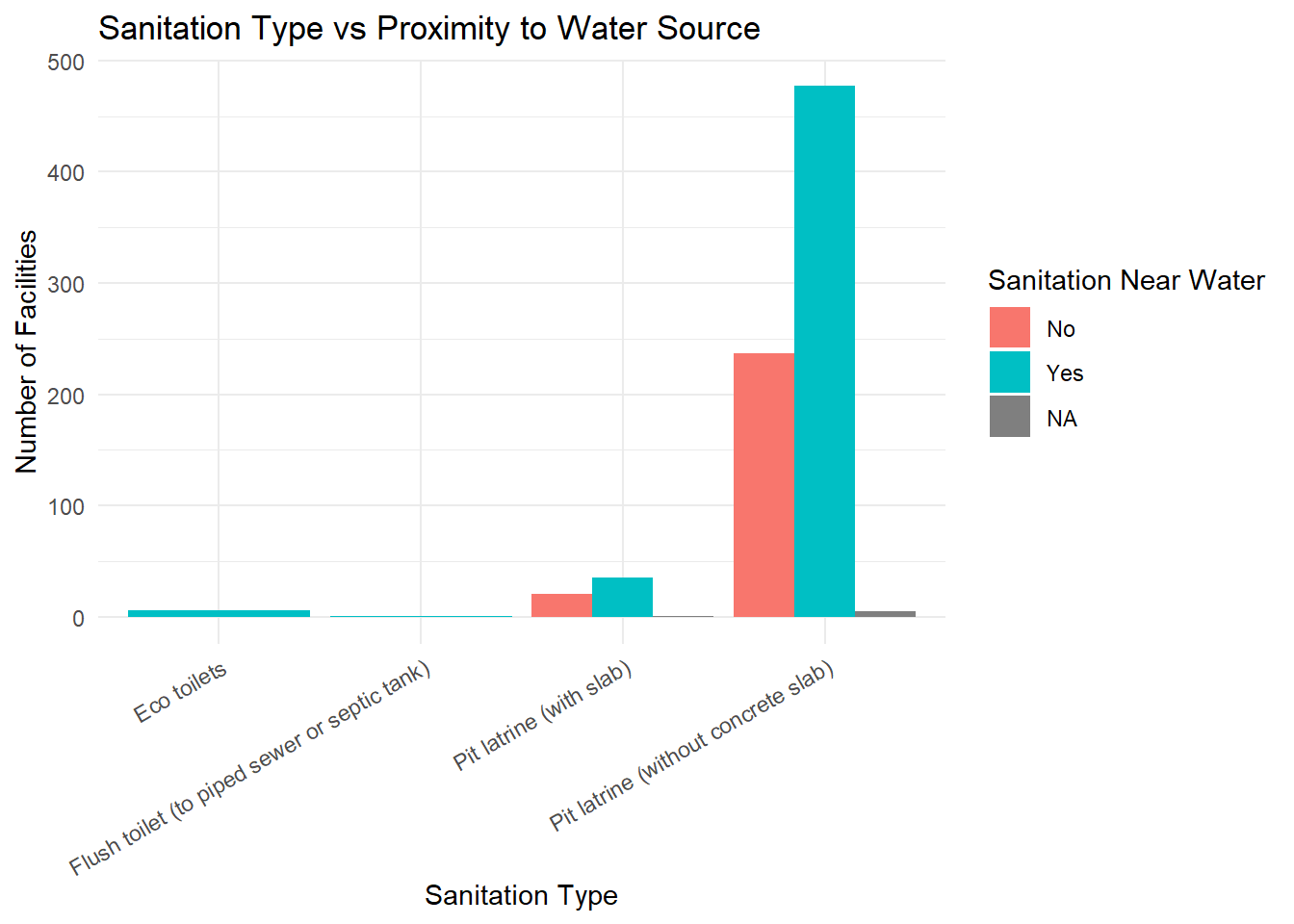 ggplot(summary_data, aes(x = sanitation_type, y = count, fill = sanitation_near_water)) +
